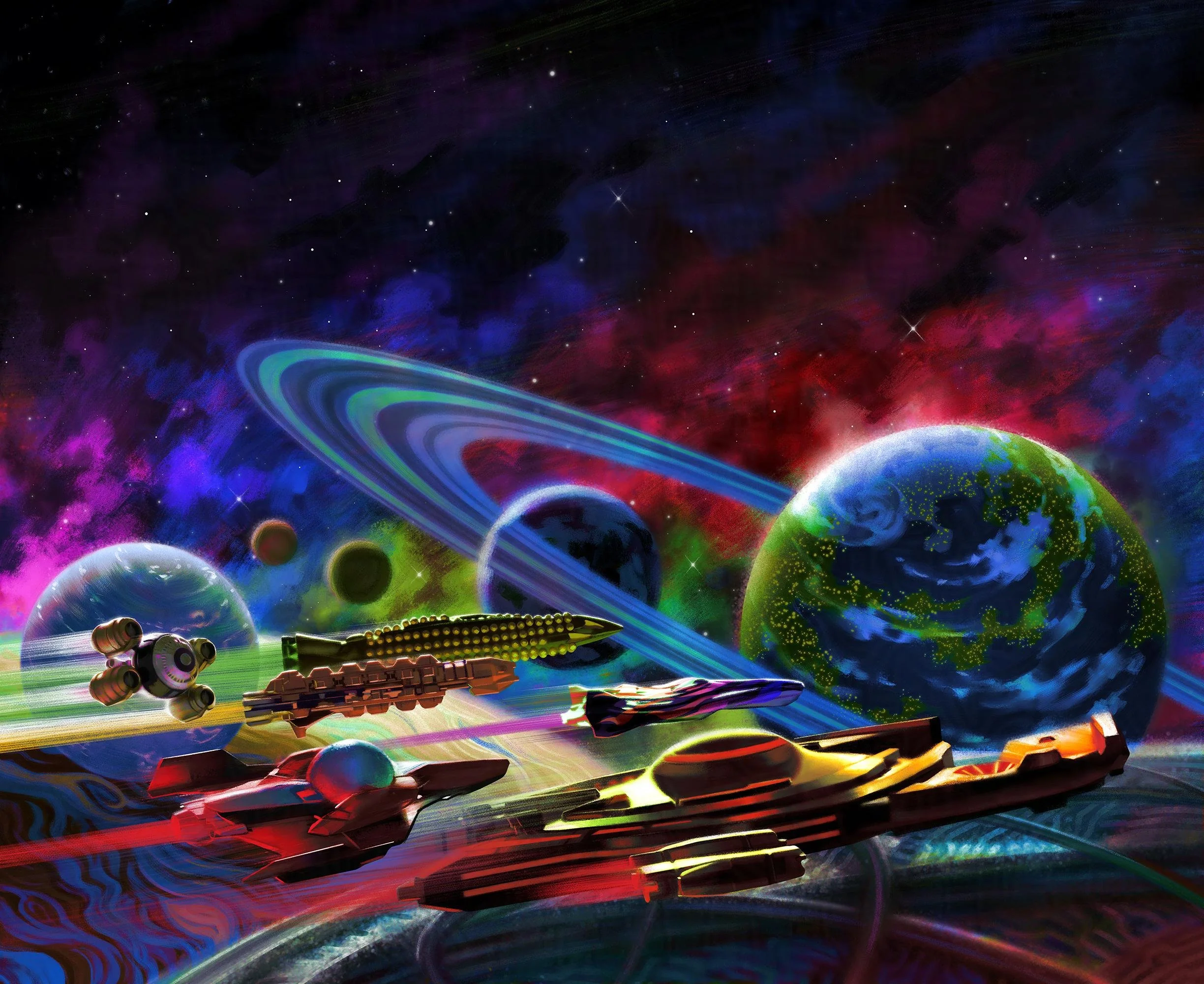 This illustration posed the challenge of integrating a large number of ships in a cohesive starscape. Ships were kit-bashed from existing 3D models and arranged in Blender to provide reference for the complexities of their mechanical forms. Melding the 3D models into the illustrated composition for this project involved paintover work. Forms were simplified and elements of lighting were exaggerated to fit the style of painting.
